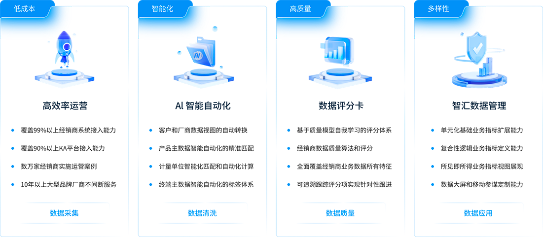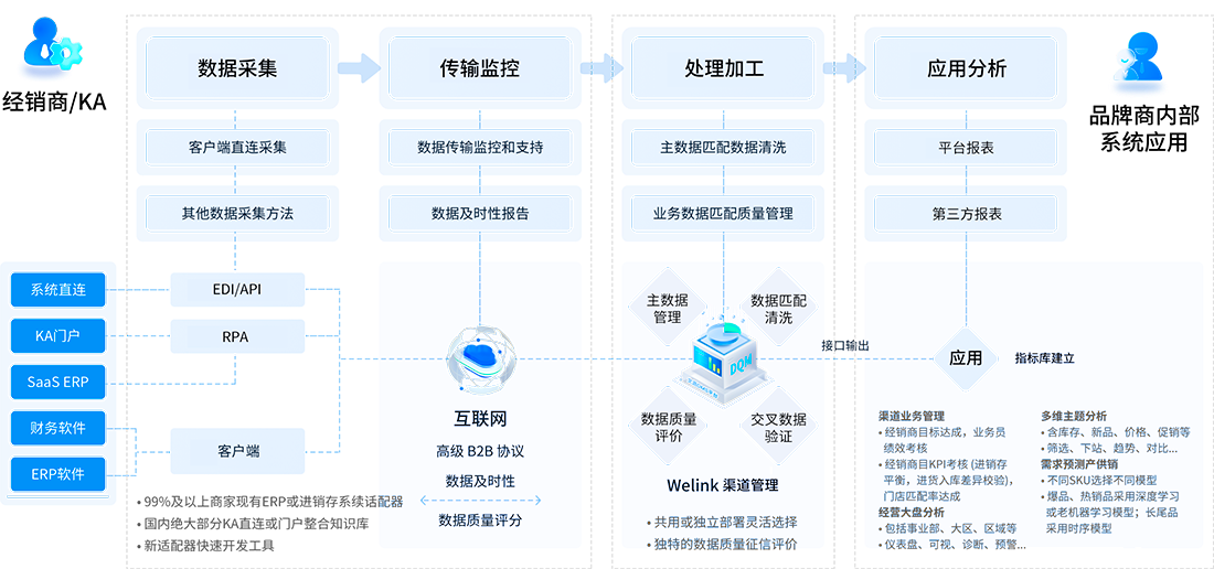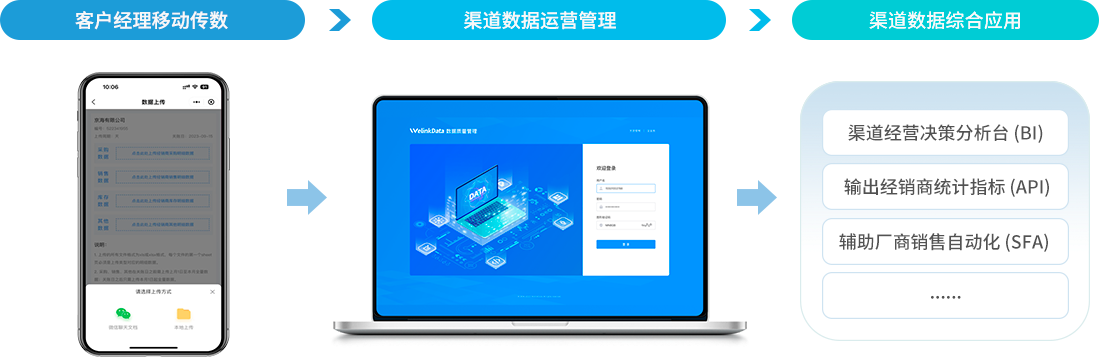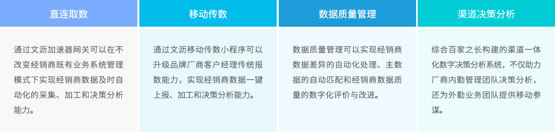 文沥渠道数字化产品提供一体化经销商管理解决方案,包括经销商业务数据共享的自动化实现(直连取数或移动传数)、经销商业务数据高质量的自动化治理和精准的数据质量评价(数据质量管理)以及整合百家知名品牌制造商经验的数字一体化应用(渠道决策分析)。