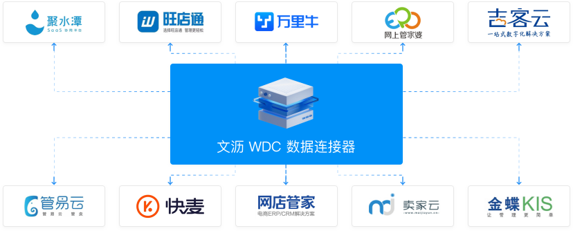 文沥WDC数据连接器可直连各类云端系统和本地系统,包含各类主流电商ERP等, 稳定获取和安全传输大批量数据。覆盖9大类数据包含平台数据、店铺数据、商品数据、订单数据、用户数据、营销数据、物流数据、售后数据、财务数据。