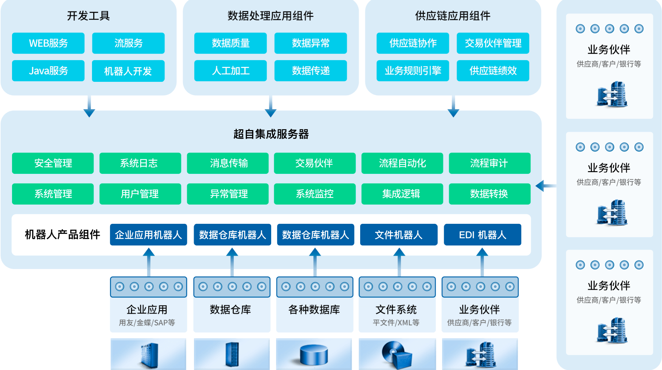 智汇超自网关支持数百种市场主流ERP、供应链、财务系统机器人适配,主要用于对接企业应用系统,自动采集、安全传输、智能处理企业供应链、B2B等数据,同时提供了可视化开发工具,通过拖拽即可简单实现机器人的开发和端到端流程自动。