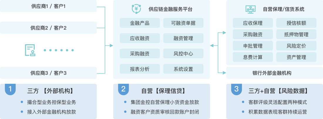 以客户需求为核心,统一面客入口,支持产业端多样化业务场景客群通过门户与平台交互,根据业务场景,提供PC端、移动端、以及与业务系统集成等入口,灵活、便捷、高效。提供自营类、撮合类、信用类、控货类、担保类、保理类等多种产品组合,扩大客群覆盖度,提升客群服务质量。
