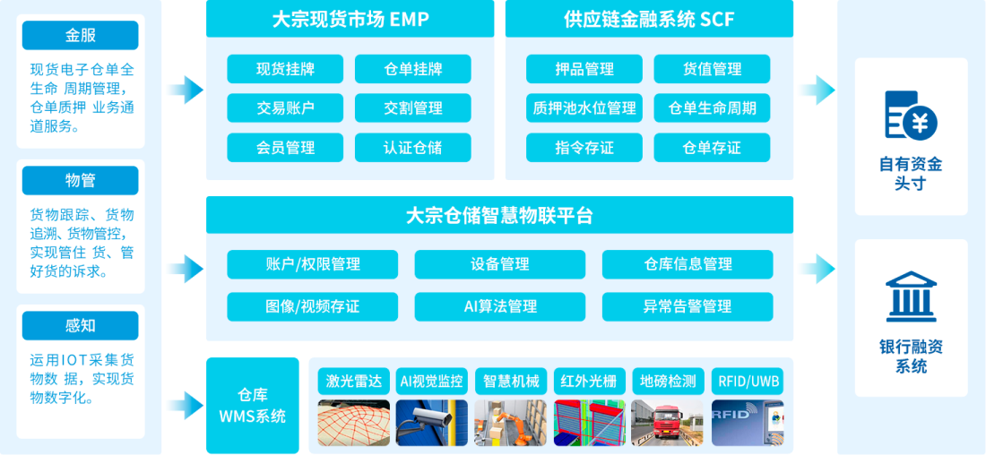 结合大宗商品交易平台,无论是现货市场还是电商化交易,提供基于相关货物交易和服务包括仓单开具、数据上链、企业征信、支付服务等多种产品组合提供协同服务。